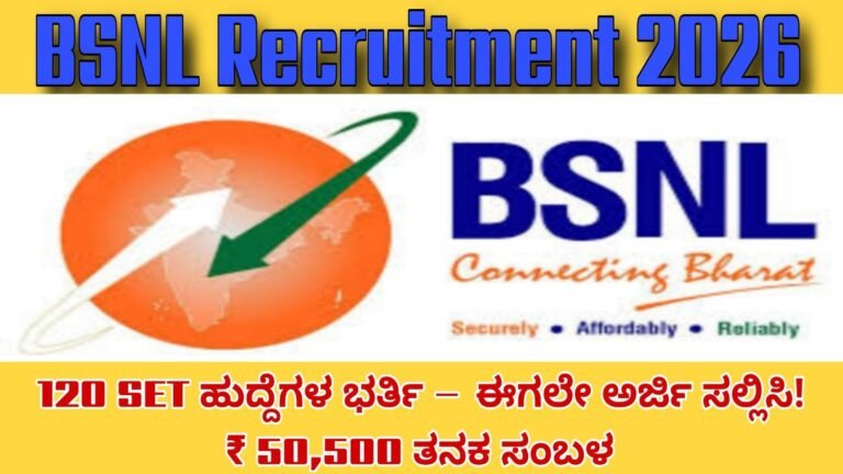 📢 BSNL Recruitment 2026: 120 SET ಹುದ್ದೆಗಳ ಭರ್ತಿ – ಈಗಲೇ ಅರ್ಜಿ ಸಲ್ಲಿಸಿ! ₹ 50,500 ತನಕ ಸಂಬಳ 😲🔥 ಭಾರತದ ಟೆಲಿಕಾಂ ಕ್ಷೇತ್ರದಲ್ಲಿ …